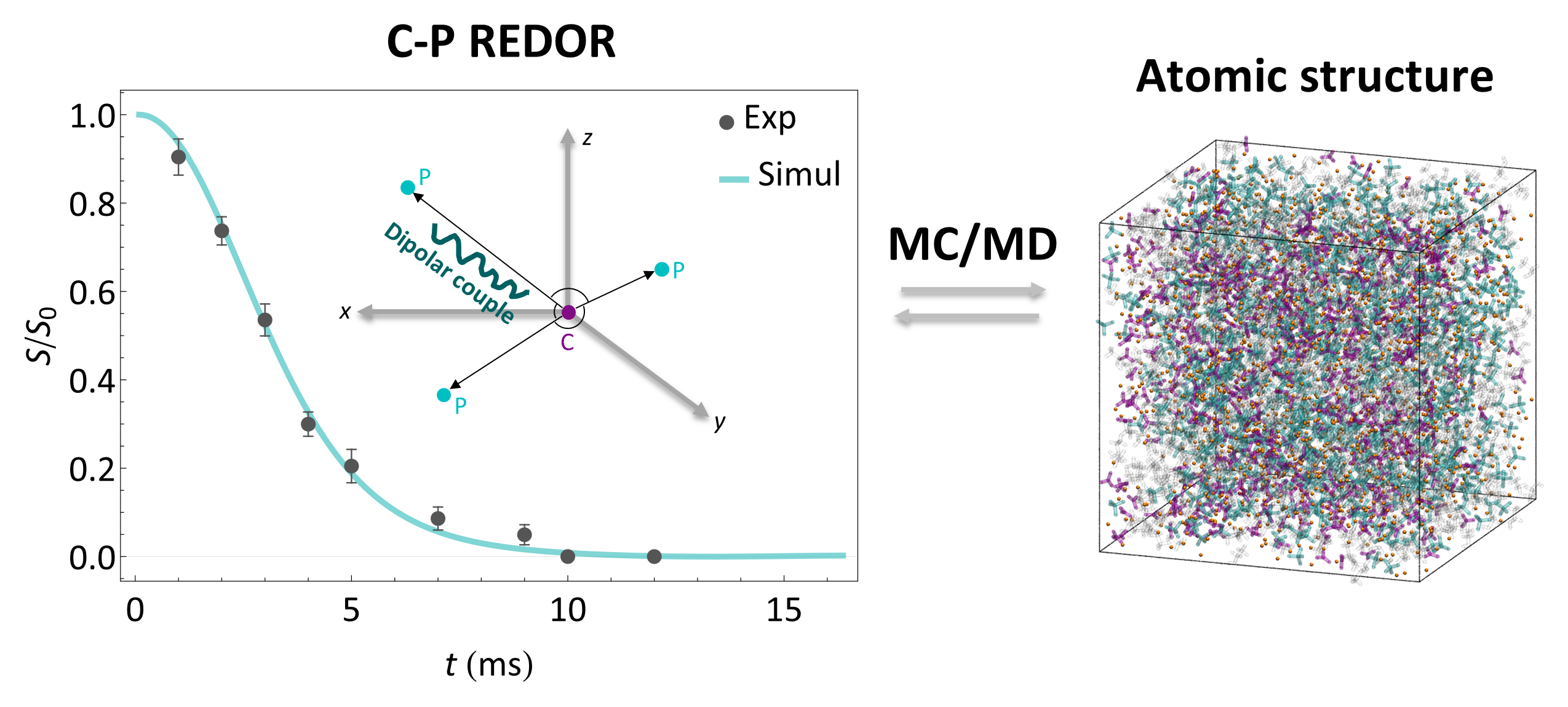 Amorphous solids, which do not possess the long-range order, hold great promise in mechanical, optical, and chemical properties, etc., and have also been revealed as critical biomineralization precursors. However, fundamental questions about their three-dimensional (3D) atomic structure remain challenging due to the long-range disorder. Conventional protocols probe such molecular structures through scattering or real-space imaging. The former provides ensemble-averaged data that masks local structural deviations, while the latter is hampered by the electron-beam sensitivity of materials. Nevertheless, based on distance-sensitive heteronuclear coupling, rotational echo double resonance (REDOR), a specialized solid-state nuclear magnetic resonance (NMR) measurement, is efficient in detecting local deviations and usually nondestructive. Here, using amorphous calcium carbonate/phosphate Ca(CO3)x(PO4)2(1-x)/3?(0 x?<1, CaCPs) solids synthesized by ion cross-linking as an example, we develop a nondestructive method to reveal local deviations of amorphous ionic solids by combining REDOR, Monte Carlo (MC), and molecular dynamic (MD) simulation. Briefly, MC simulations generated atomic structures with heterogeneous medium-range spatial apportionment of ions, and MD simulations relaxed the initial configuration to rationalize short-range order. Then, theoretical REDOR decay curves of MC/MD-generated structures were compared with experimental values to check the medium-range order. We revealed that there was heterogeneous medium-range spatial apportionment of anions in CaCPs. Because solid-state NMR applies to virtually any spin-bearing material, this methodology provides an alternative route to resolve the atomic structure of amorphous solids.