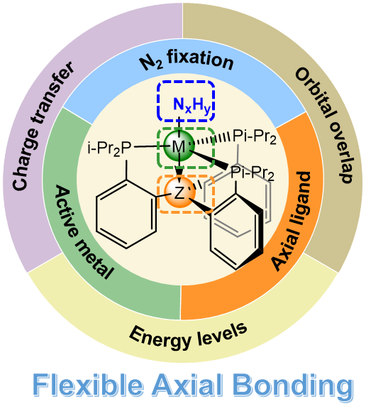 The conversion of molecular dinitrogen (N2) into ammonia (NH3) is one of the most important chemical processes. The hemilabile axial bonding in the transition metal (TM) complexes with?d-p,?d-d?and?d-df?interactions could provide an electron reservoir that controls the evolution of the oxidation state on the active center, which is potential to facilitate N2-to-NH3?conversion. In this perspective, the bionic nitrogen fixing process is illustrated on a molecular level, which features flexible axial bonding to regulate “electron reservoir”. The comprehensive overview summarizes the features of TM complexes with axial supporting ligand and focuses on how the axial ‘‘a(chǎn)ssistant” atom tunes the electronic properties of the metal center to facilitate dinitrogen binding, as well as proton/electron delivery in N2?reduction. To illustrate the mechanism of axial ‘‘electron reservoir” in dinitrogen fixation on different TM complexes with axial supporting ligand, the relationships of geometric parameters, the variation of electronic structure and oxidation state, the influence principles of axial bonding regulated by anchor atoms, the critical roles of peripheral ligands and the overall comprehension from orbital interaction are all involved. A preliminary view of the major challenges and future opportunities of TM dinitrogen complexes with flexible axial bonding is highlighted at the end. Through this perspective, we hope to give a comprehensive demonstration of the flexible axial bonding as “electron reservoir” in dinitrogen fixation, and shed light on the rational design for fabricating efficient catalysts in the future.