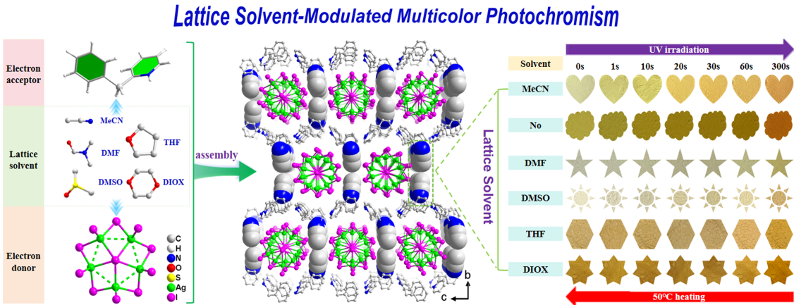 Reversible multicolor photochromic materials based on electron donor-acceptor (EDA) systems have recently attracted considerable attention due to their potential applications in displaying, ink-free erasable printing and anti-counterfeiting. However, it is extremely challenging to realize multicolor photochromism by using same EDA system. Herein, a novel EDA iodoargentate hybrid, [(2-Bz-pyH)(Ag5I6)]·MeCN (1) (2-Bz-pyH+?= N-protonated 2-benzylpyridinium, MeCN = acetonitrile), has been obtained via solvent evaporation method at room temperature. Interestingly, upon ~ 365 nm Hg lamp irradiation, 1 and MeCN-desolvated 1 (denoted 1-H) display lattice solvent-modulated multicolor photochromic performance (pale yellow to brown for 1, yellow to reddish brown for 1-H) and fast response time (within 1 s). Additionally, 1-H was separately fumigated with DMF/DMSO/THF/DIOX vapors, and these samples also exhibit different photochromic properties under the same light conditions. Meanwhile, the new photochromic mechanism of intermolecular charge transfer composite with photolysis iodoargentate frameworks has been proposed through the combination of experimental and theoretical investigations. These results provide a new perspective for designing multicolor photochromic materials through lattice solvent-modulated same EDA system.