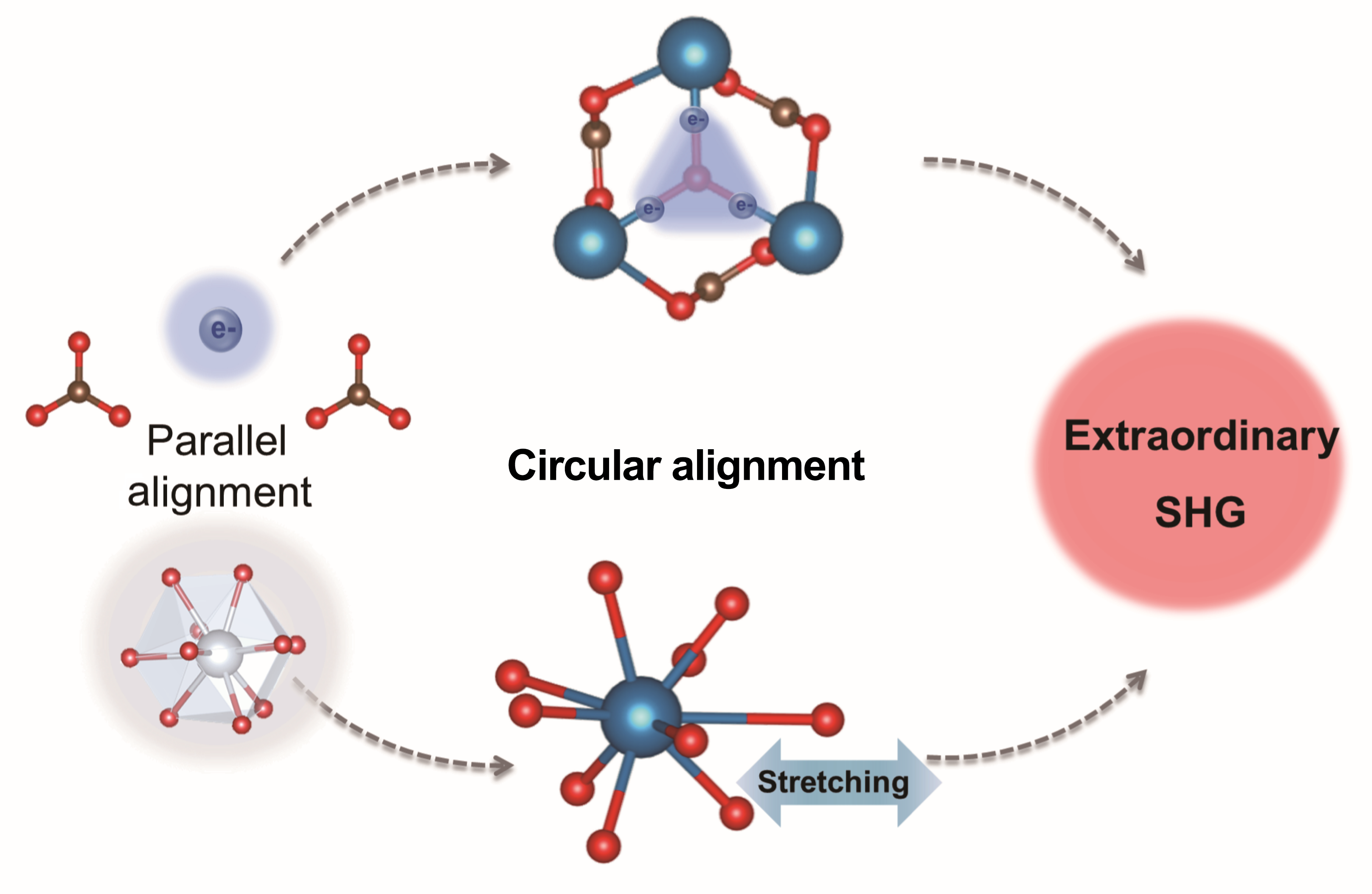 Nonlinear optical (NLO) crystals with efficient frequency conversion are essential for all-solid-state lasers, and exploring new second harmonic generation (SHG) enhancing strategy is crucial for the structure-property relationship research and application of NLO crystals. Conventional strategies focus on inducing parallel alignment of NLO active units. In this work, two new regulation means,?i.e.?bond polarization and flexible deformation, have been identified in rare earth carbonates REXCO3?(RE = La, Ce, Y; X = OH, F) with anionic motifs circular aligned through experimental characterization and first-principles calculations. They can promote the SHG effect in the form of electronic polarization and polyhedra distortion, respectively. Such regulation methods break the common acceptation that only carbonates aligning in a parallel pattern can effectively achieve the superposition of hyperpolarizabilities and result in considerable SHG effect. By realizing the synergistic effect of circular alignment and rare earth polyhedra, the polarizability and flexible stretching ability of the RE-O coordination bonds are effectively exerted in the designed structure,?C2_La2O2CO3. This work unveils a new mechanism for SHG enhancement in rare earth carbonates and provides new insight for designing advanced NLO materials.