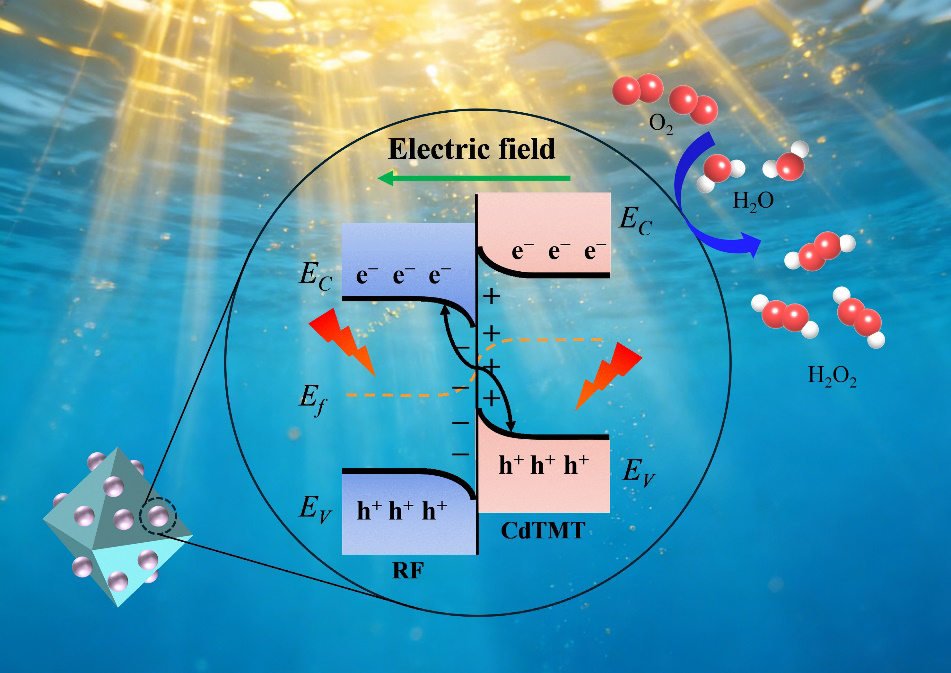 Photocatalytic hydrogen peroxide (H2O2) production (PHP) using solar energy exhibits remarkable advantages of environmental friendliness and a lack of pollution compared to the current anthraquinone method, however the production efficiency of PHP is limited by the rapid recombination of photogenerated carriers. In this study, we successfully synthesized a resorcinol-formaldehyde resin/Cd3(C3N3S3)2?(RF/CdTMT) S-scheme heterojunction photocatalyst via the oil bath method to enhance PHP. A series of characterization tests confirm the successful construction of an S-scheme heterojunction which enhances the separation efficiency of photogenerated carriers. Through X-ray photoelectron spectroscopy (XPS) and density functional theory (DFT) calculations the charge transfer mechanism of the S-scheme heterojunction is confirmed. In pure water, the photocatalytic H2O2?production performance of the composite is significantly enhanced: 15.15 times that of the single catalyst CdTMT and 3.01 times that of the RF, with excellent cycling stability. This study confirms that the S-scheme heterojunction can effectively suppress the recombination of photogenerated carriers, thereby enhancing the efficiency of photocatalytic reactions and providing new insights for efficient photocatalytic H2O2?production.