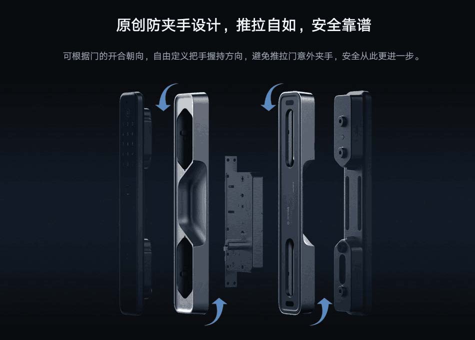 小米智能門(mén)鎖M20 采用高強(qiáng)度合金中框與一體化IML 工藝完美契合,正面黑晶面板上的隱形觸控按鍵和指示燈,讓整個(gè)門(mén)鎖渾然一體。無(wú)論是正面還是側(cè)面,M20 將小米的簡(jiǎn)約風(fēng)格做到了極致。創(chuàng)新地采用了單邊內(nèi)凹防夾手把手設(shè)計(jì),可根據(jù)門(mén)的開(kāi)合朝向,自定義把手的握持方向,避免推拉門(mén)意外夾手。