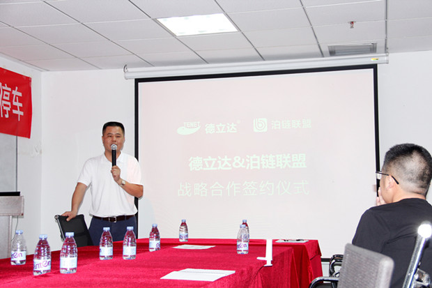 德立達(dá)董事長(zhǎng)黃思林與泊鏈聯(lián)盟楊義平在合作戰(zhàn)略書(shū)上相互簽字。