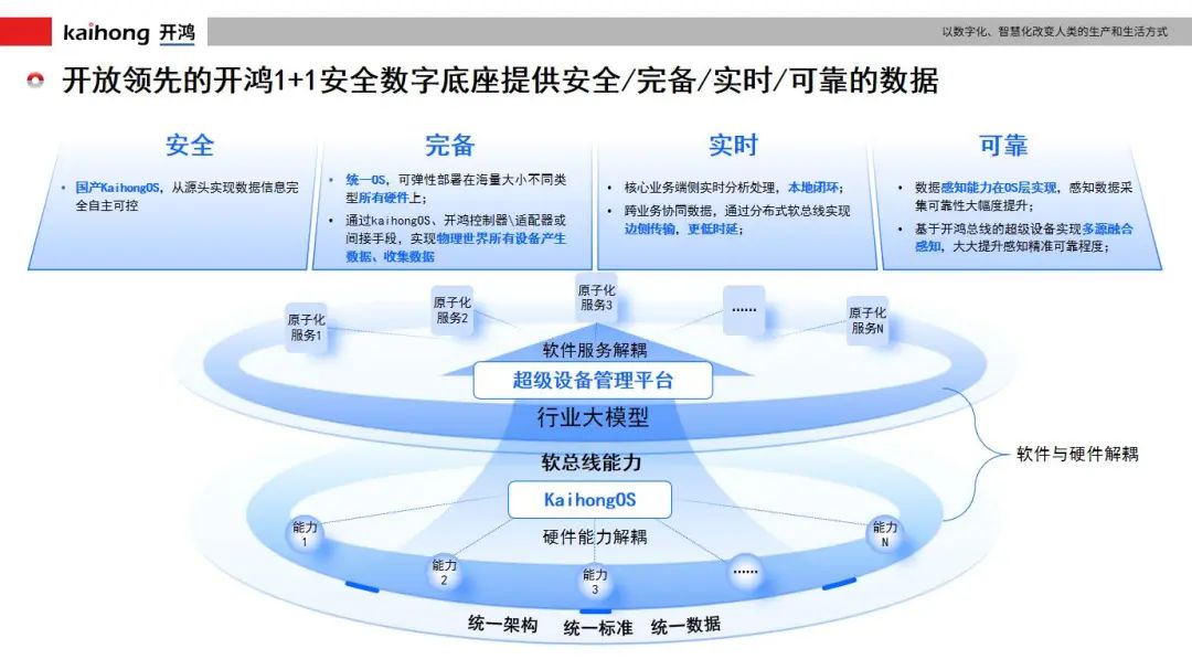 其次,數(shù)字化本身的轉(zhuǎn)型,核心一定是數(shù)據(jù),需要采集到物理世界的高質(zhì)量的數(shù)據(jù)非常重要。開源鴻蒙本身目前是實現(xiàn)物理世界數(shù)據(jù)采集最好的手段,因為這個系統(tǒng)本身有兩個特點,第一,這個系統(tǒng)幾乎能裝在所有的硬件設(shè)備上;第二,設(shè)備數(shù)據(jù)產(chǎn)生的控制權(quán)或者是決定權(quán)全在系統(tǒng)。所以基于開源鴻蒙,就意味著人們能拿到最安全、最完備、最可靠、最實時的數(shù)據(jù)。有了這個數(shù)據(jù)以后,再在上面疊加行業(yè)領(lǐng)域AI大模型等創(chuàng)新應(yīng)用,才真正能實現(xiàn)數(shù)字化。
