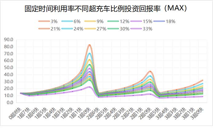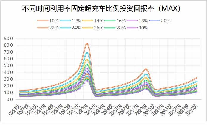 假設(shè)四:在超充車(chē)占比不變的情況下,充電終端平均時(shí)間利用率不斷提高,不同的充電站配置投資收益變化。