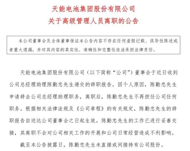 另?yè)?jù)8月28日消息,天能股份發(fā)布公告,因個(gè)人原因,陳勤忠申請(qǐng)辭去總經(jīng)理助理職務(wù),離職后,陳勤忠不再擔(dān)任公司任何職務(wù)。