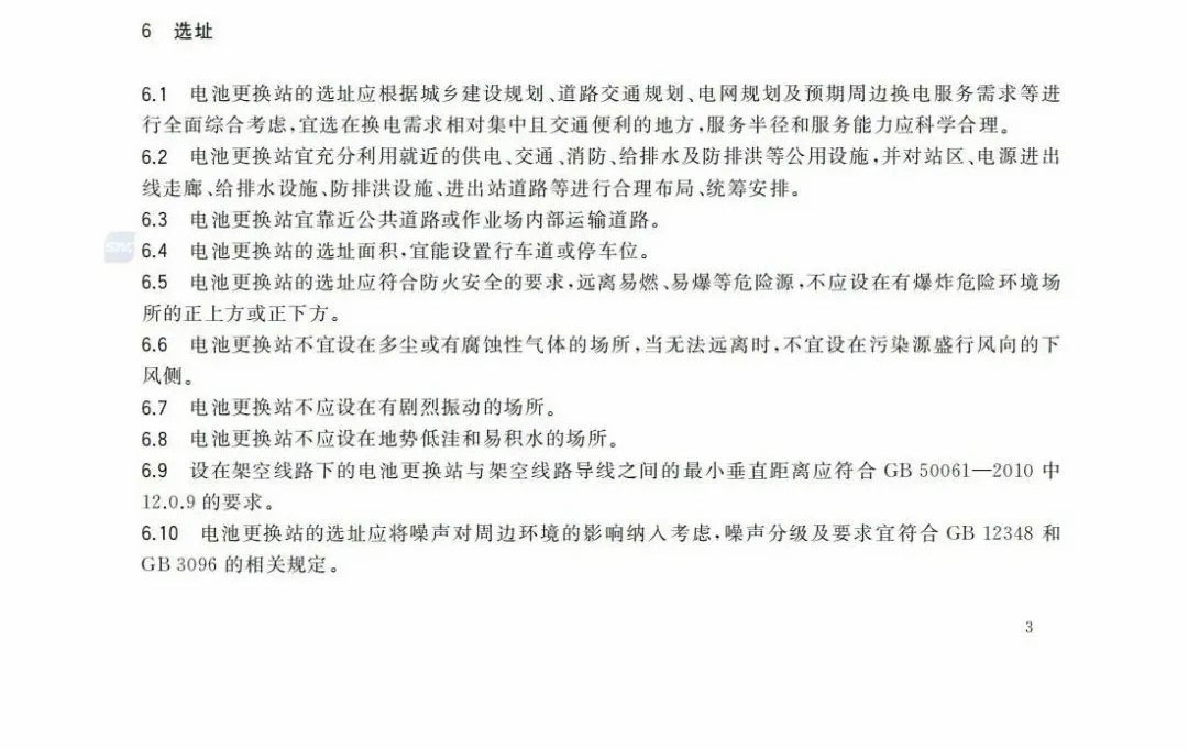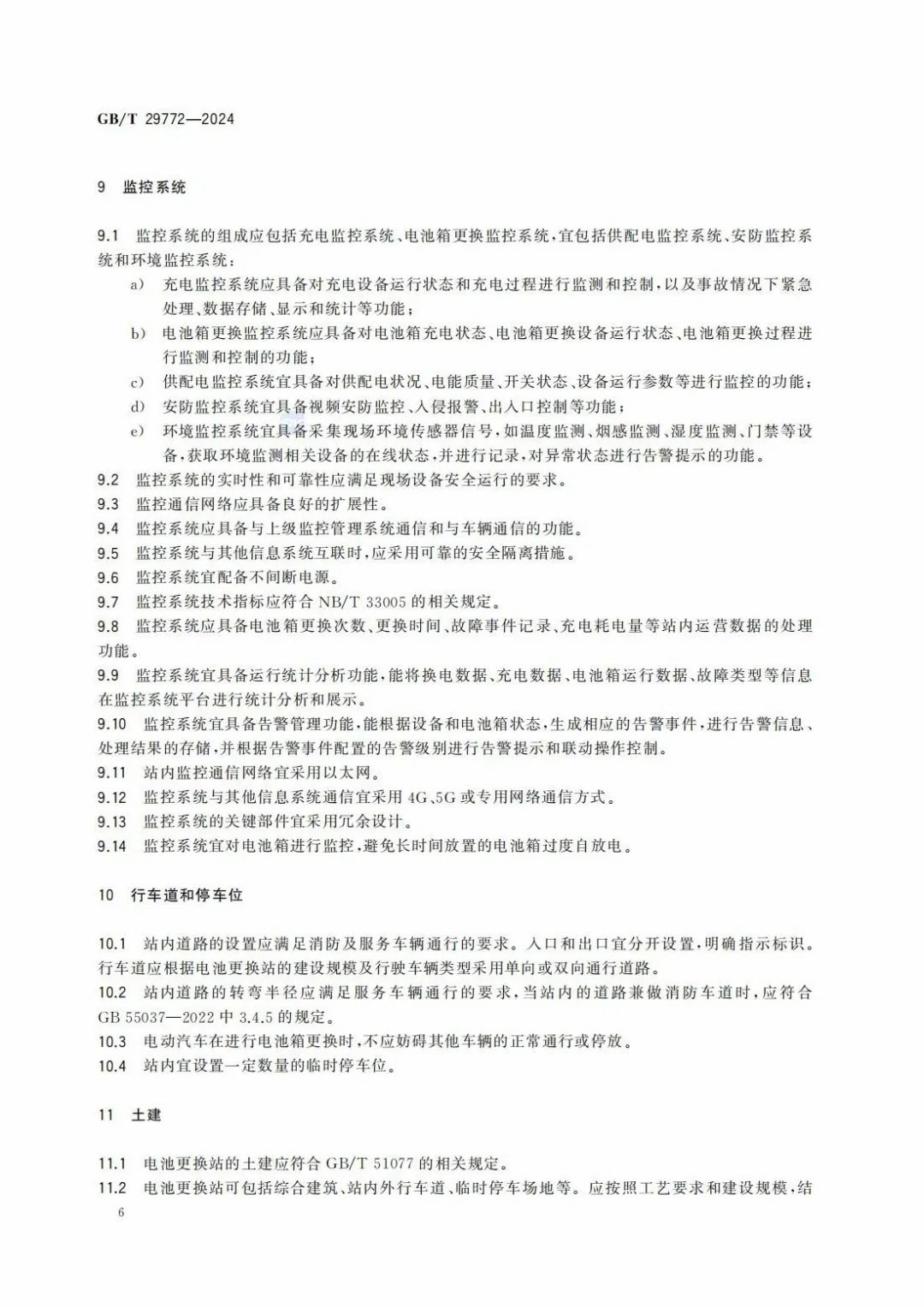 修訂后的《電動(dòng)汽車電池更換站通用技術(shù)要求》(GB/T 29772—2024)推薦性國(guó)家標(biāo)準(zhǔn)規(guī)定了電動(dòng)汽車電池更換站的總體要求、分類、選址、供配電系統(tǒng)、充電與電池更換系統(tǒng)、監(jiān)控系統(tǒng)、行車道和停車位、土建、安全和消防以及標(biāo)志和標(biāo)識(shí)。