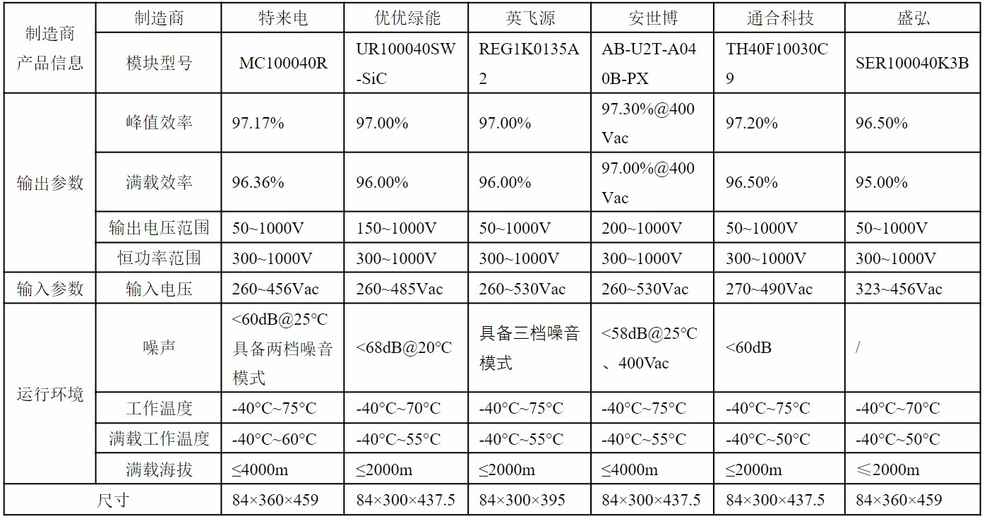 下表所示為業(yè)內(nèi)主流40kW SiC高效充電模塊主要參數(shù)對比: