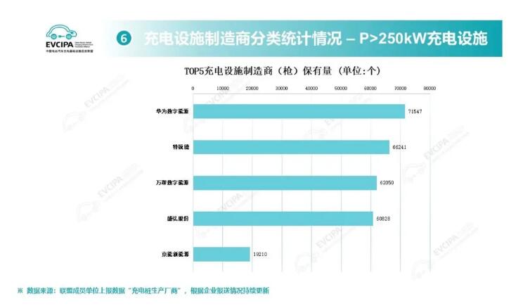 根據(jù)企業(yè)上報的充電樁制造商(槍)數(shù)量統(tǒng)計,>250kwTOP5充電樁制造商(槍)保有量排行分別為華為7.2萬個、特銳德(特來電)6.6萬個、萬幫數(shù)字能源(星星充電)6.2萬個、盛弘股份6萬個、京能新能源1.9萬個。構(gòu)成當(dāng)前國內(nèi)充電設(shè)備制造端第一梯隊。