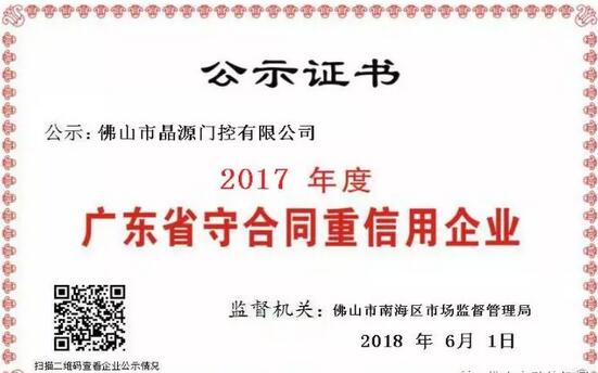 6月1日,佛山金嘉豪、金鴻星、南海鼎新機電、晶源、東龍萬家順門業(yè)五家電動伸縮門企業(yè)迎來喜訊,經廣東省工商行政管理局批準,他們均獲得"2017年度廣東省守合同重信用企業(yè)"證書。