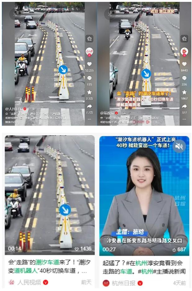 潮汐車道機器人在杭州的 “首秀”,迅速獲得官方媒體矩陣全方位聚焦,形成 “從地方到中央、從圖文到視頻” 的傳播熱潮: