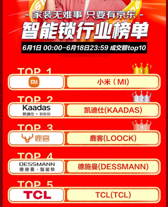 根據(jù)京東、天貓官方平臺數(shù)據(jù)顯示,智能鎖品牌銷量亮眼,其中,來自京東居家的戰(zhàn)報顯示,小米,凱迪仕、鹿客、德施曼、TCL、飛利浦、希箭、三星、石將軍、箭牌榮登成交額TOP10.