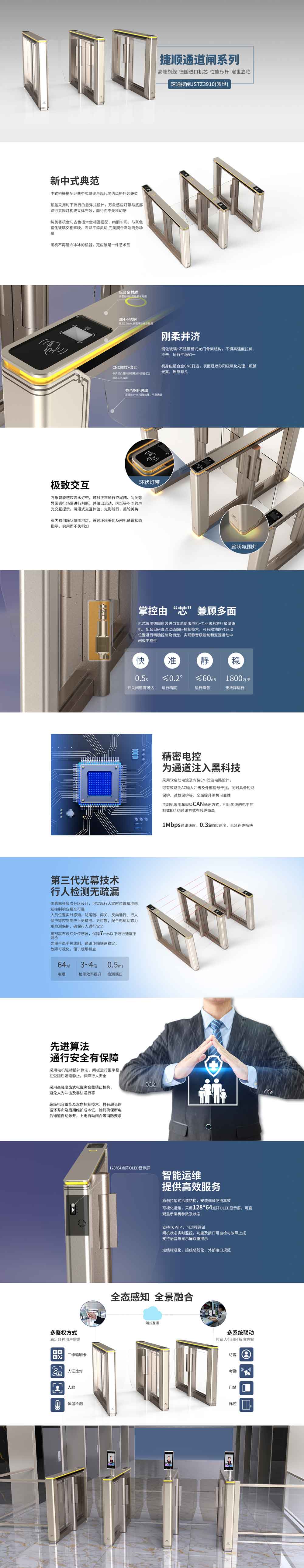 速通擺閘JSTZ3910(曜世)是捷順通道閘的旗艦產(chǎn)品,將新中式元素與北歐簡約設(shè)計風(fēng)格巧妙結(jié)合,定位于甲級與5A寫字樓及政府機構(gòu)大堂等高端室內(nèi)場所使用。外殼由合金打造,氧化著色盡顯商務(wù)質(zhì)感。自研伺服驅(qū)動編碼控制技術(shù)配合插補算法,保證閘板運行的精確與穩(wěn)定,平均無故障運行次數(shù)可達(dá)1800萬次。采用第三代光幕檢測技術(shù),檢測間距更小,靈敏度更高,通行更安全。