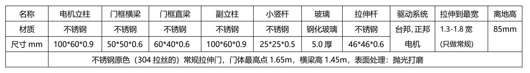 活動部位特點:最小寬度1.3米最大可拉伸至1.8米。驅(qū)動采用品牌DC24V直流無刷減速電機驅(qū)動,配L型減速機,具有高轉(zhuǎn)矩低溫升,高承載,高效環(huán)保等特點。驅(qū)動控制主板采用全數(shù)字電路,體積小、調(diào)試便利,無線遙控。防撞、防夾、自動開關門、開關門速度,緩沖速度、關門力度可自由調(diào)節(jié),實現(xiàn)無人值守。運行、啟停,性能穩(wěn)定。