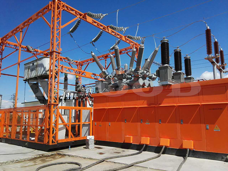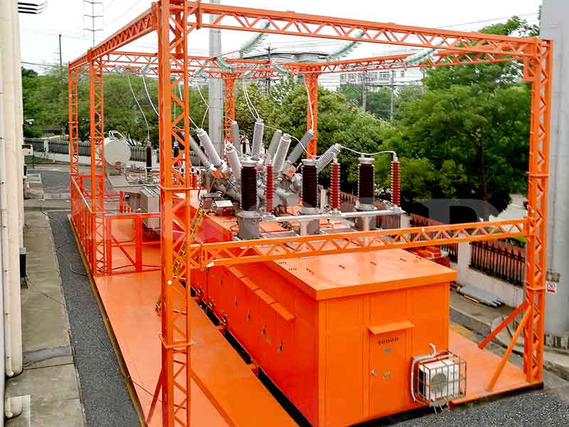 移動(dòng)變電站含主變壓器、高壓設(shè)備、中壓設(shè)備、二次設(shè)備,所有設(shè)備自帶鋼制底座,一二次線纜側(cè)近側(cè)出,運(yùn)抵現(xiàn)場(chǎng)后無(wú)需制做基礎(chǔ),只需將原站改造部分負(fù)荷轉(zhuǎn)移到移動(dòng)變中即可,現(xiàn)場(chǎng)工作量極小,布局靈活、可快速投運(yùn)。