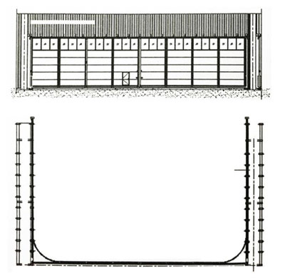 側(cè)轉(zhuǎn)式飛機(jī)庫(kù)大門采用下承重上導(dǎo)向的承重形式。主要由上下導(dǎo)軌、上下導(dǎo)向輪、門扇、鉸鏈、周邊密封條、開門傳動(dòng)機(jī)構(gòu)、電控系統(tǒng)等部件組成。其中門扇采用鋁合金型材或?qū)S眯弯撟鐾饪?,門板采用聚氯酯發(fā)泡門板。電控采用集成電路控制。門扇和門扇之間采用鉸鏈連接,門扇的下部裝有下導(dǎo)向輪.在下導(dǎo)軌中滾動(dòng)。當(dāng)開門傳動(dòng)機(jī)構(gòu)工作時(shí),牽引門體向90°方向側(cè)轉(zhuǎn),實(shí)現(xiàn)門扇的開啟,反向門扇關(guān)閉。門體到位后有行程限位開關(guān)限位。主要適用于戰(zhàn)斗機(jī)、直升機(jī)機(jī)庫(kù)、大型船廠等場(chǎng)所。