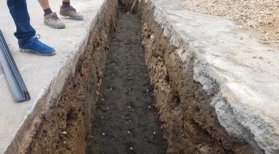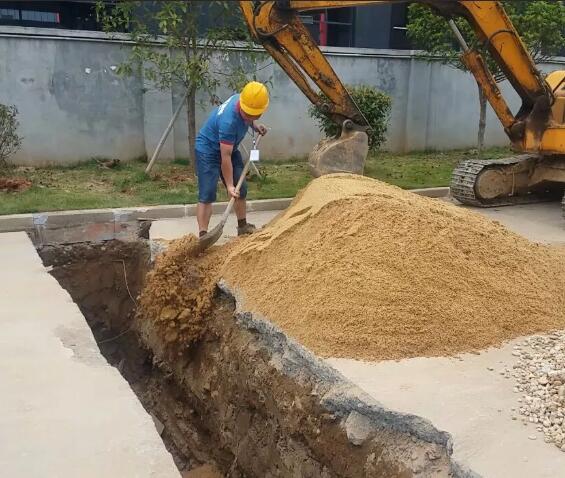 回填砂石,回填至距離地面30cm左右,澆水沉降2小時(shí)候后夯實(shí)。