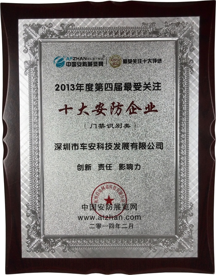 車安科技作為安防一卡通優(yōu)秀供應商及領導者,榮獲“2013年最受關注十大安防企業(yè)”榮譽,車安科技作為《GA/T 761-2008 停車庫(場)安全管理系統(tǒng)技術要求》、《GA/T 992-2012 停車庫(場)出入口控制設備技術要求》等國家停車場行業(yè)標準制訂企業(yè),繼續(xù)專注于安防一卡通產品創(chuàng)新。車安一直堅持“以科技為動力,以質量求發(fā)展”的質量方針,奉行“科技創(chuàng)新、信譽第一、顧客至上”的經營方針,樹立“預防為主,安全生產;以人為本,健康生活;遵紀守法,持續(xù)改進”的職業(yè)健康安全方針。注重建立專業(yè)品牌,不斷完善產品售后服務體系,設立24小時服務熱線,隨時隨地竭誠為廣大用戶服務。把創(chuàng)立具有國際競爭力的中國品牌作為己任,處處以最高標準要求自己,由此贏得了廣大用戶的贊譽,不斷擴大在中國停車場智能化領域的影響力,并逐漸發(fā)展壯大成為領航中國安防行業(yè)的龍頭企業(yè)。