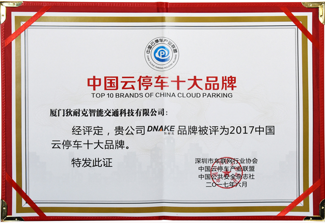 狄耐克智能交通榮獲“2017中國(guó)云停車(chē)十大品牌”稱(chēng)號(hào)