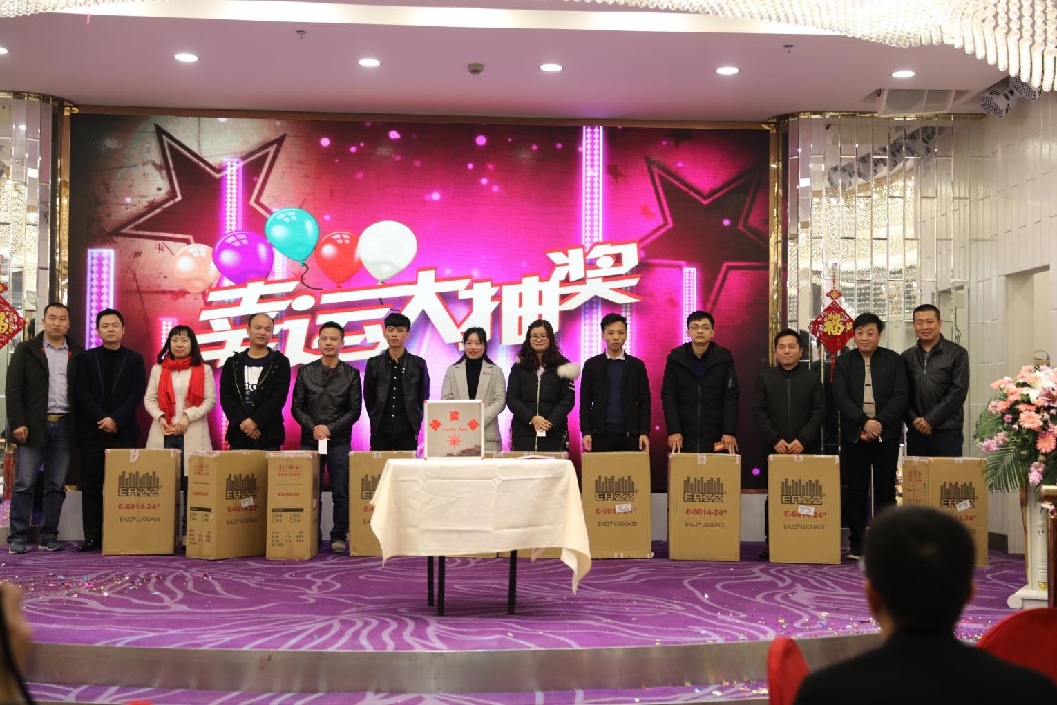 財(cái)務(wù)部蔣總(左一)、總經(jīng)辦黃總(右一)抽取三等獎(jiǎng),并與中獎(jiǎng)?wù)吆嫌?