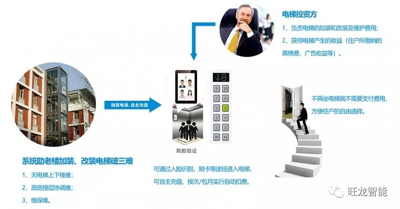 基于此種現(xiàn)狀,旺龍創(chuàng)新性提出“智慧社區(qū)·共享電梯/加裝改造電梯”的概念及實行方案,推出乘梯計費、自主充值的方案和新的商業(yè)運營模式:用戶進(jìn)入社區(qū)單元電梯通過人臉識別、刷卡等途徑,自動扣費乘梯,用戶可通過按次、包月計費,通過微信、支付寶進(jìn)行自主充值,這樣就很人性化、柔性地解決老樓改造加裝電梯中遇到的難題,助力舊樓改造、加裝電梯項目的順利實施。