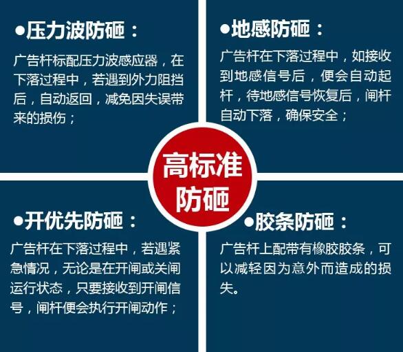 多重保護(hù)措施(防風(fēng)保護(hù)、電機(jī)熱保護(hù)、抗電涌保護(hù)等),極大提高廣告道閘運(yùn)行的安全性和可靠性。