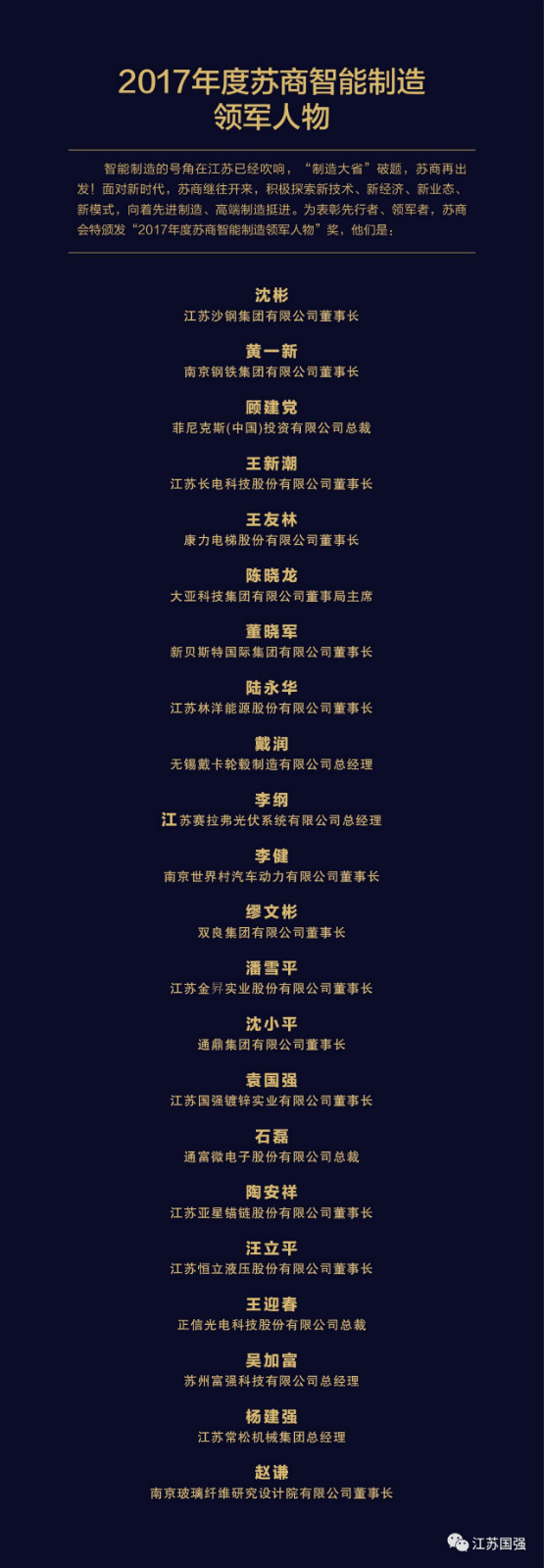 本次大會江蘇國強集團董事長榮獲“2017年度蘇商智能制造領軍人物”。