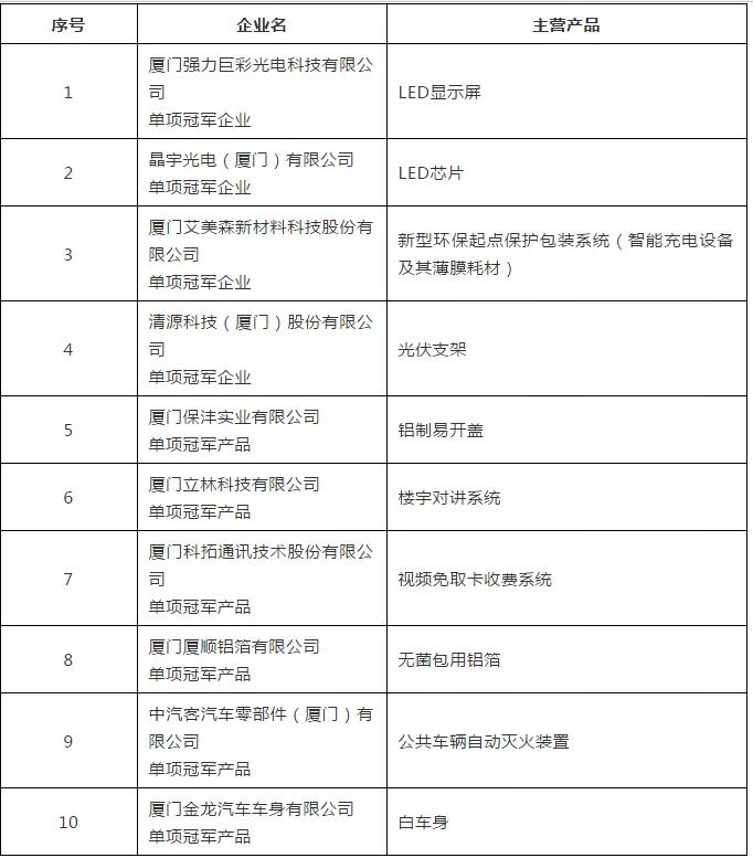 福建省第三批制造業(yè)單項冠軍(產(chǎn)品)一覽表(廈門)