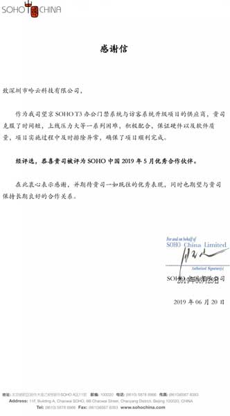 昨日,令令開門收到一封特別的感謝信。SOHO中國致謝令令開門,并評(píng)選令令開門為SOHO中國2019年5月優(yōu)秀合作伙伴。