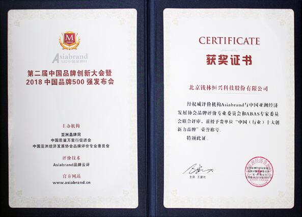 大會期間,隆重揭曉了“2018中國品牌500強、中國品牌日年度人物大獎、中國品牌年度創(chuàng)新人物、中國十大工匠品牌、中國十大創(chuàng)新力品牌”等榜單和獎項,并舉行了隆重的頒獎儀式。北京錢林恒興科技股份有限公司(證券代碼:871112)憑借其超強的技術創(chuàng)新能力,以及技術創(chuàng)新成果轉化能力,成功摘取“中國(行業(yè))十大創(chuàng)新力品牌”殊榮!