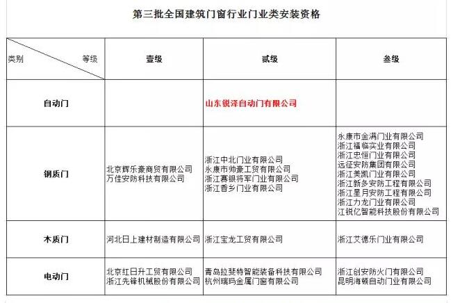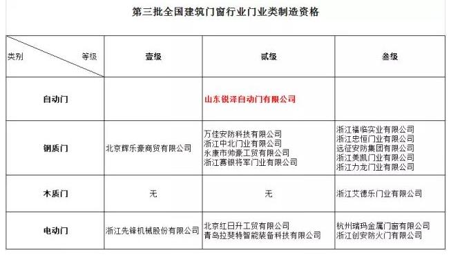 9月18日,第三屆中國西部門窗博覽會在成都世紀城新國際會展中心開幕,同期召開“2016年中國西部門業(yè)發(fā)展高峰論壇”并頒發(fā)第三批通過建筑門窗企業(yè)行業(yè)資格登記證書,其中山東銳澤榮獲自動門類制造及安裝兩項行業(yè)二級企業(yè)資格證書,同時也是本批次唯一入選的自動門生產(chǎn)、安裝企業(yè)。