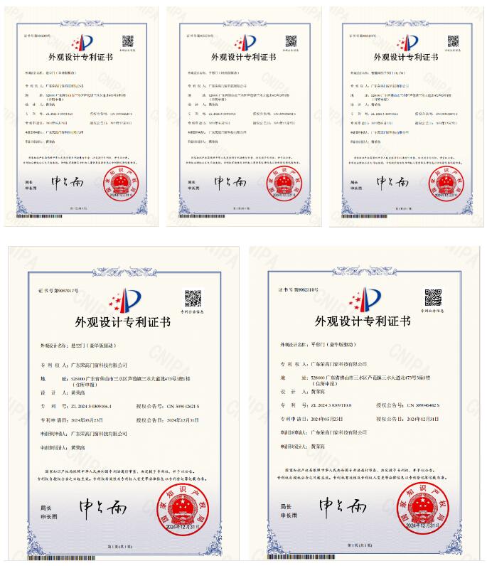 專利為翼,創(chuàng)新飛翔。2024年榮高智能伸縮門申報(bào)的五項(xiàng)外觀設(shè)計(jì)專利《智能伸縮平移門(U170)》、《平移門(時(shí)尚版驅(qū)動(dòng))》、《平移門(豪華版驅(qū)動(dòng))》、《懸空門(豪華版驅(qū)動(dòng))》、《懸空門(至尊版驅(qū)動(dòng))》,均順利通過了國家知識(shí)產(chǎn)權(quán)局的嚴(yán)格審查,正式被國家知識(shí)產(chǎn)權(quán)局授權(quán)并頒發(fā)了外觀設(shè)計(jì)專利證書。