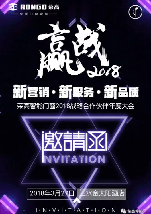 榮高智能門窗將于3月27日在佛山三水金太陽酒店舉行榮高智能門窗2018戰(zhàn)略合作伙伴年度大會(huì),這場(chǎng)盛宴將帶來一波顛覆性的“干貨”。