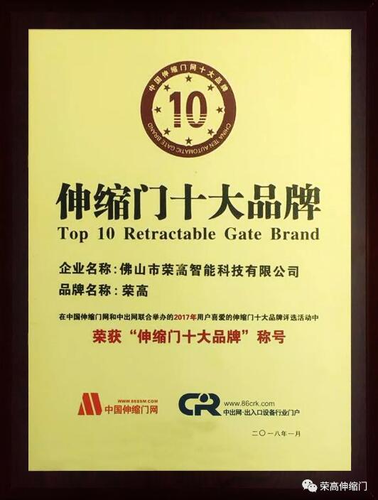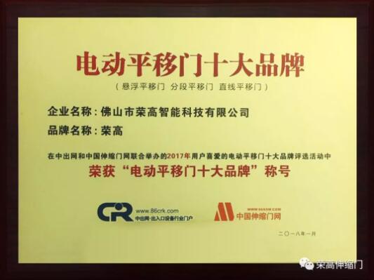 2018,狗年開門紅!3月9日,榮高智能門窗應(yīng)邀參加第一屆中國(北京)電動圍墻門科技成果發(fā)布會暨2017年度中國伸縮門、電動平移門十大品牌頒獎盛典。榮高智能門窗再次斬獲“伸縮門十大品牌”、“電動平移門十大品牌”兩大殊榮。