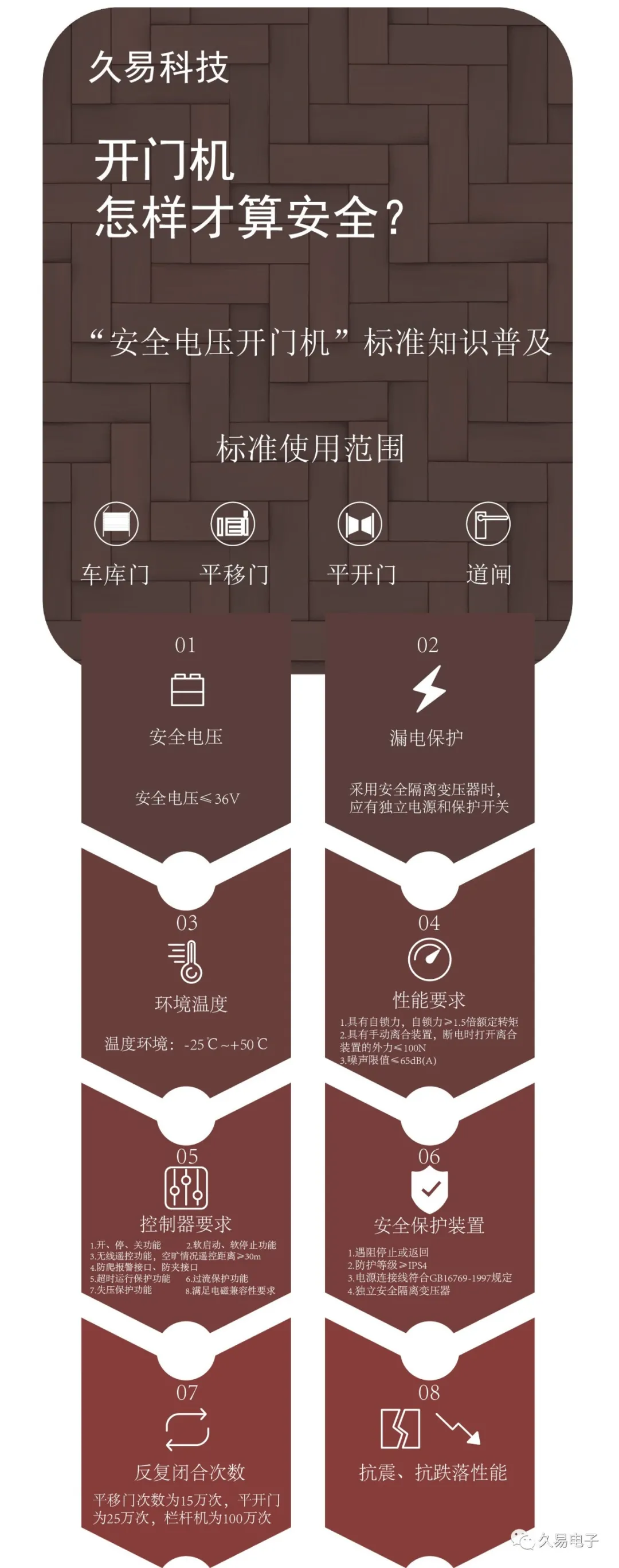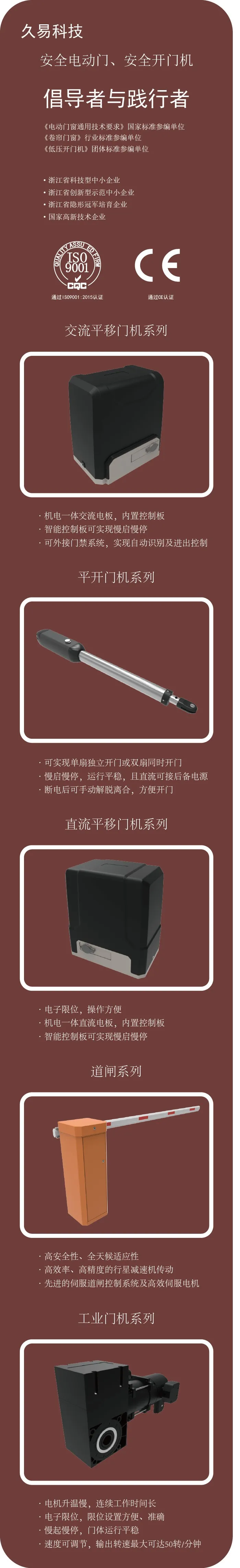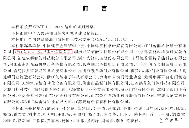 浙江久易電子科技股份有限公司作為此項(xiàng)國標(biāo)的參編單位,主要參與了電動門、電動開門機(jī)、室內(nèi)門等通用技術(shù)要求的內(nèi)容編訂,標(biāo)準(zhǔn)的制定和實(shí)施對提高國內(nèi)電動門窗產(chǎn)品的質(zhì)量水平和安全性能,杜絕人身傷亡事故的出現(xiàn),引導(dǎo)和規(guī)范市場健康有序發(fā)展,助力行業(yè)提升產(chǎn)品和服務(wù)供給質(zhì)量,提升用戶體驗(yàn),營造智能高效的出入環(huán)境具有重要現(xiàn)實(shí)意義。
