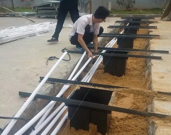 回填砂石,回填至距離地面30cm左右,澆水沉降2小時候后夯實。