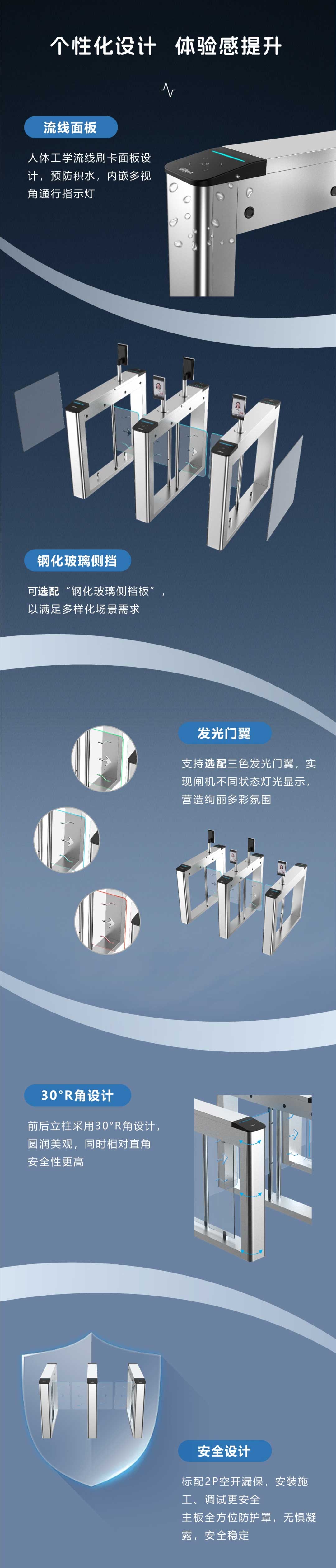 流線面板:人體工學(xué)流線刷卡面板設(shè)計(jì),預(yù)防積水,內(nèi)嵌多視角通行指示燈。