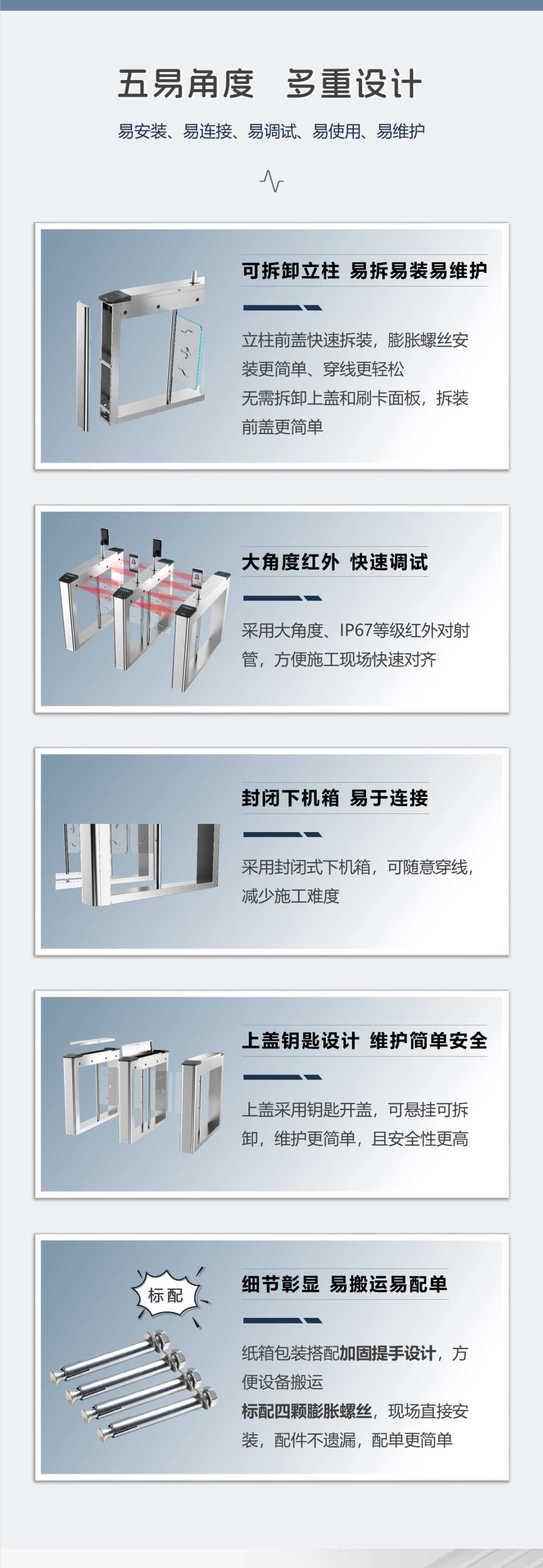 可拆卸立柱 易拆易裝易維護(hù):立柱前蓋快速拆裝,膨脹螺絲安裝更簡(jiǎn)單、穿線更輕松無需拆卸上蓋和卡面板,拆裝前蓋更簡(jiǎn)單。