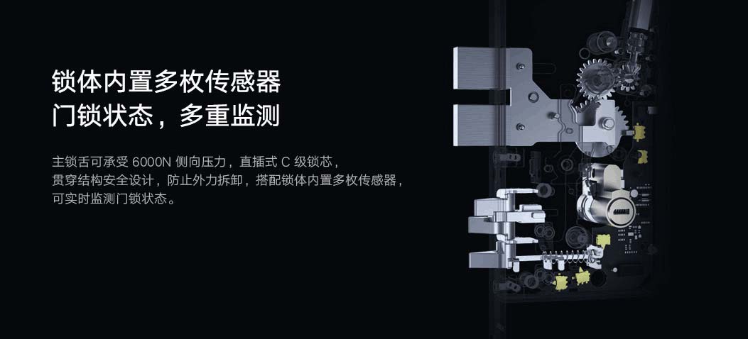 該門(mén)鎖全自動(dòng)鎖體內(nèi)搭載動(dòng)力系統(tǒng),驗(yàn)證通過(guò)后,主鎖舌快速收回,推拉把手即可開(kāi)門(mén),離家關(guān)門(mén)自動(dòng)上鎖。主鎖舌可承受6000N 側(cè)向外力,直插式C 級(jí)鎖芯,貫穿結(jié)構(gòu)安全設(shè)計(jì),防止外力拆卸。