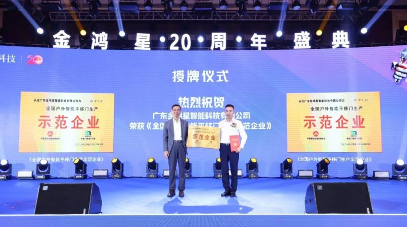 中國建筑金屬結(jié)構(gòu)協(xié)會(huì)潘冠軍副秘書長、中國建筑金屬結(jié)構(gòu)協(xié)會(huì)自動(dòng)門電動(dòng)門分會(huì)戴建國副會(huì)長、金鴻星董事長金國建、中出網(wǎng)CEO李明發(fā)先生以及客戶代表出席啟動(dòng)儀式。 同時(shí),中國建筑金屬結(jié)構(gòu)協(xié)會(huì)特授予廣東金鴻星智能科技有限公司《全國戶外智能平移門生產(chǎn)示范企業(yè)》的稱號。