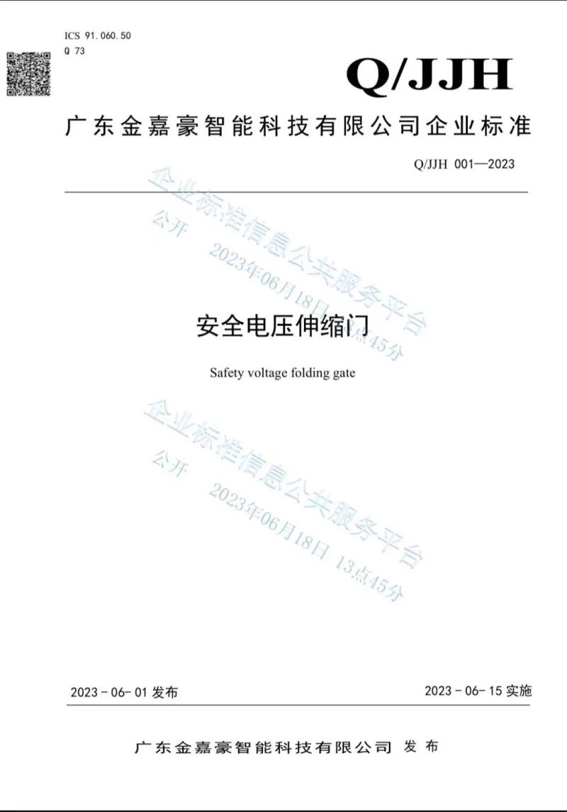 6月18日,廣東金嘉豪智能科技有限公司(以下簡稱“廣東金嘉豪”)正式施行安全電壓新標(biāo)準(zhǔn)《安全電壓伸縮門》(Q/JJH001-2023),該標(biāo)準(zhǔn)高于行業(yè)標(biāo)準(zhǔn)要求,指導(dǎo)公司安全電動伸縮門的設(shè)計、制造,為用戶提供放心、優(yōu)質(zhì)的智能出入口產(chǎn)品。
