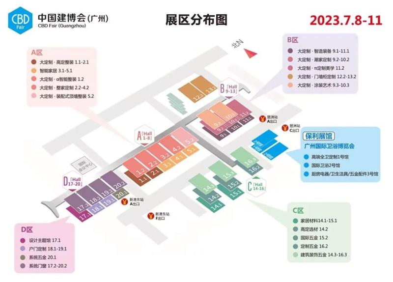 7月8-11日,作為大家居建裝行業(yè)全球第一展,2023中國建博會(廣州)將形成“定制、系統(tǒng)、智能、設(shè)計、材藝”五大主題展區(qū)及衛(wèi)浴博覽會的全新布局,參展企業(yè)近2000家、展覽面積40萬平方米。展位主要分布為A區(qū)、B區(qū)、C區(qū)、D區(qū)。