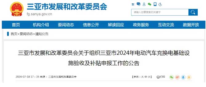 2024年7月18日,三亞市發(fā)展和改革委員會公布關(guān)于組織三亞市2024年電動汽車充換電基礎(chǔ)設(shè)施驗收及補貼申報工作的公告。其中明確提出:
