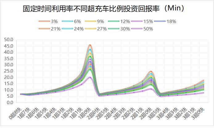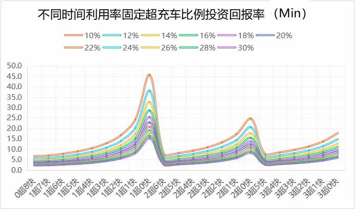 假設(shè)三:保持現(xiàn)有的充電終端的平均時(shí)間利用率不變的情況下,超充車(chē)輛占比提升,不同的充電站配置投資收益變化