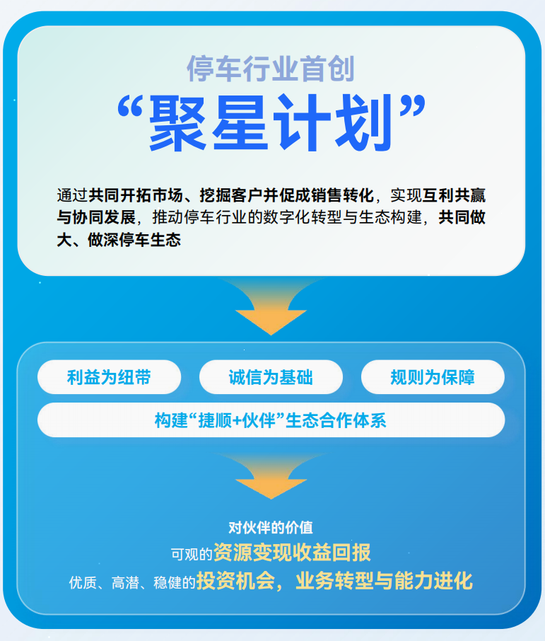 9月27日,捷順科技正式對(duì)外宣布,推出行業(yè)首創(chuàng)生態(tài)合作伙伴“聚星計(jì)劃”。“聚星計(jì)劃”的核心理念在于開(kāi)放合作、互利共贏。捷順認(rèn)為,停車(chē)資產(chǎn)數(shù)字化運(yùn)營(yíng)管理的廣闊市場(chǎng)需要各界力量的共同參與和推動(dòng)。因此,“聚星計(jì)劃”誠(chéng)邀各界精英加盟,以停車(chē)資產(chǎn)數(shù)字化運(yùn)營(yíng)管理為“利劍”,共同開(kāi)辟市場(chǎng),挖掘客戶,實(shí)現(xiàn)銷(xiāo)售轉(zhuǎn)化,共享發(fā)展成果。
