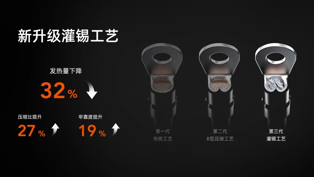 灌錫工藝再突破:基于B型端子壓接技術,優(yōu)化內部導電結構,熱點發(fā)熱量直降32%,高溫工況性能飆升,充電效率與安全“雙在線”。