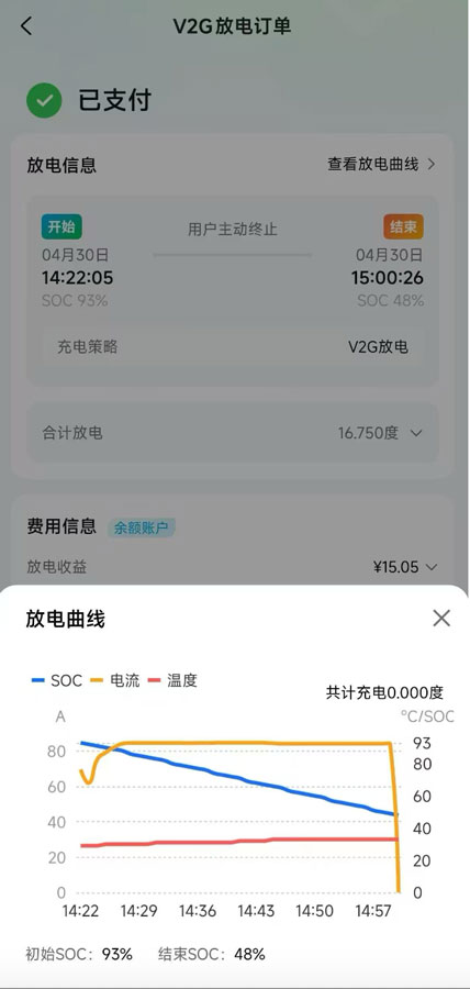 在超充站,郭誠剛向研究員展示了車主如何通過車網(wǎng)互動放電。在40分鐘內,電動汽車通過車網(wǎng)互動放電約16.75度電,收入15.05元。郭誠剛談到,一般在工作日上班時間,車主可通過手機APP選擇充電結束時間,同時設置放電模式,實現(xiàn)充放電。以中環(huán)大場超充站為例,如果按照每個車網(wǎng)互動雙向充電樁每天放電1次(40度電/次)來算,預計年充/放電量可達2.8萬度。