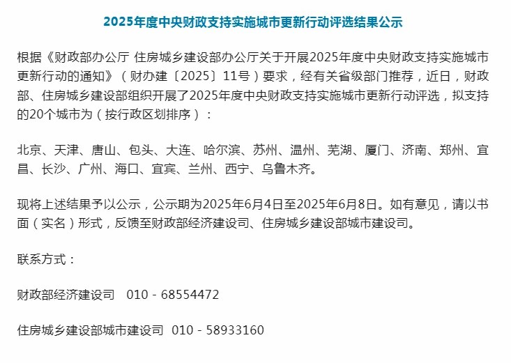 據(jù)財政部最新消息,根據(jù)《財政部辦公廳 住房城鄉(xiāng)建設(shè)部辦公廳關(guān)于開展2025年度中央財政支持實施城市更新行動的通知》(財辦建〔2025〕11號)要求,經(jīng)有關(guān)省級部門推薦,近日,財政部、住房城鄉(xiāng)建設(shè)部組織開展了2025年度中央財政支持實施城市更新行動評選,擬支持的20個城市為(按行政區(qū)劃排序):