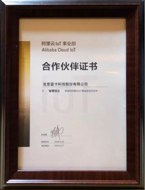 北京藍(lán)卡科技股份有限公司總裁周璇女士作為阿里云IoT行業(yè)合作伙伴代表出席了授牌儀式。
