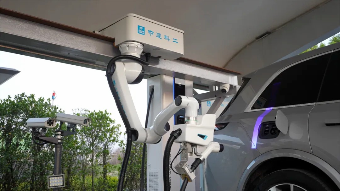 中建科工生產(chǎn)的充美移動充電機器人,配備柔性機械臂,插槍精度高;支持 V2X 車網(wǎng)互動技術;單臺機器人可同步管理多臺車輛。解決充電槍太重問題,對女性車主更加友好。